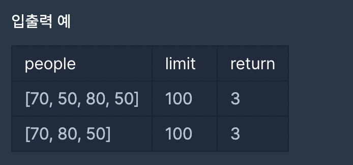์ฌ๋๋ค์ ๋ชธ๋ฌด๊ฒ๋ฅผ ๋ด์ ๋ฐฐ์ด people๊ณผ ๊ตฌ๋ช ๋ณดํธ์ ๋ฌด๊ฒ ์ ํ limit๊ฐ ๋งค๊ฐ๋ณ์๋ก ์ฃผ์ด์ง ๋, ๋ชจ๋ ์ฌ๋์ ๊ตฌ์ถํ๊ธฐ ์ํด ํ์ํ ๊ตฌ๋ช ๋ณดํธ ๊ฐ์์ ์ต์๊ฐ์ return ํ๋๋ก solution ํจ์๋ฅผ ์์ฑํด์ฃผ์ธ์.