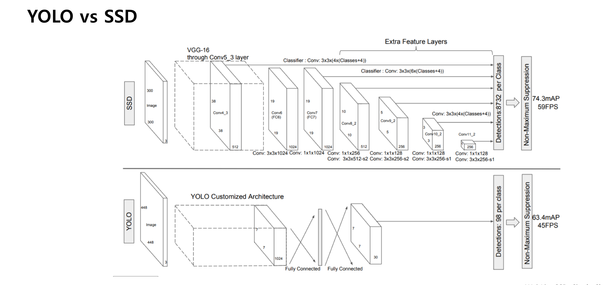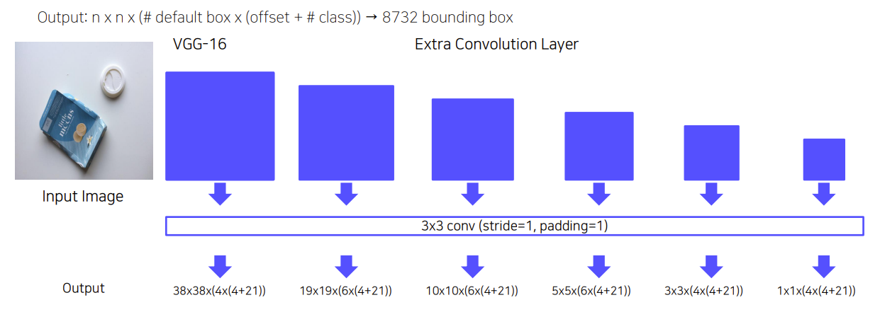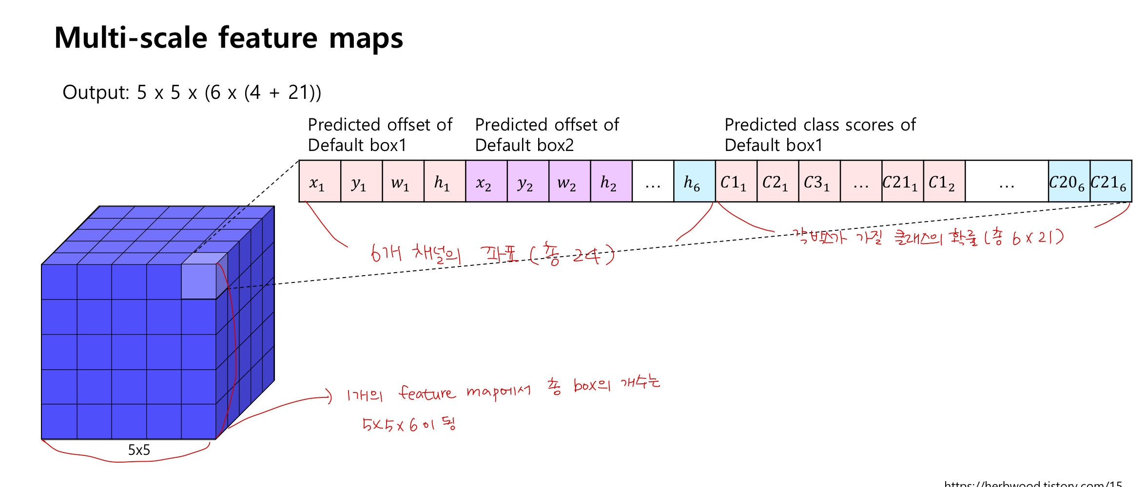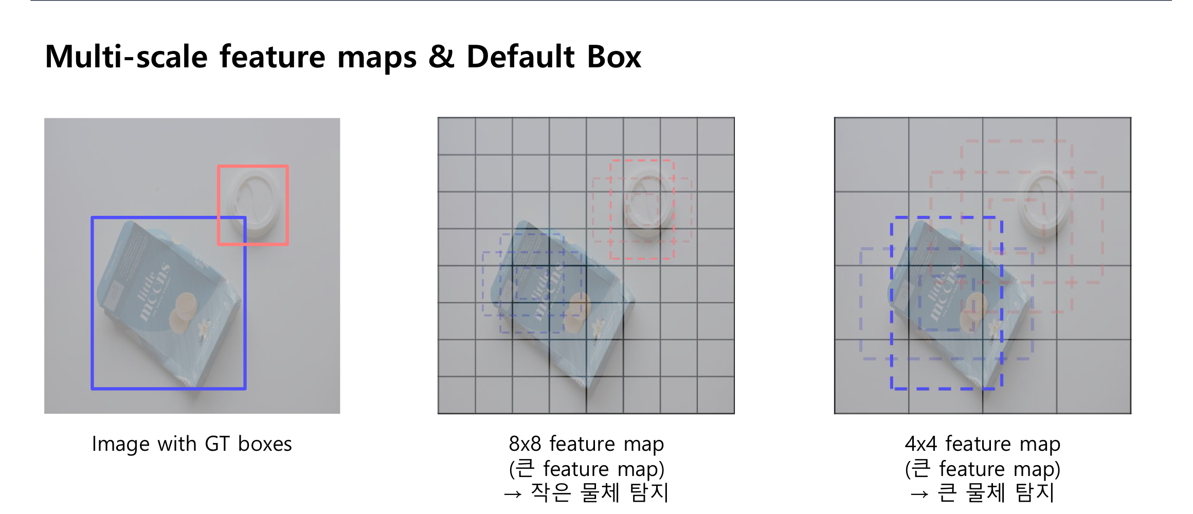 - Default box (anchor box) ์ฌ์ฉํด ์๋ก ๋ค๋ฅธ scale๊ณผ ๋น์จ์ ๊ฐ์ง ๋ฏธ๋ฆฌ ๊ณ์ฐ๋ box ์ฌ์ฉ