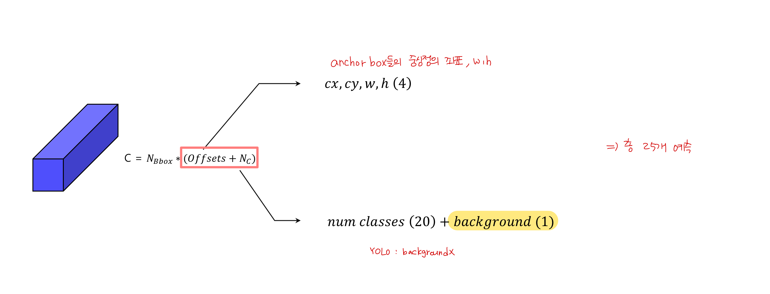 anchor box๋ค์ ์ค์ฌ์ ์ ์ขํ์ class์ ๊ฐ์ + 1 (background) => ์ด 25๊ฐ์ ์์ธก๊ฐ์ด ๋์ด