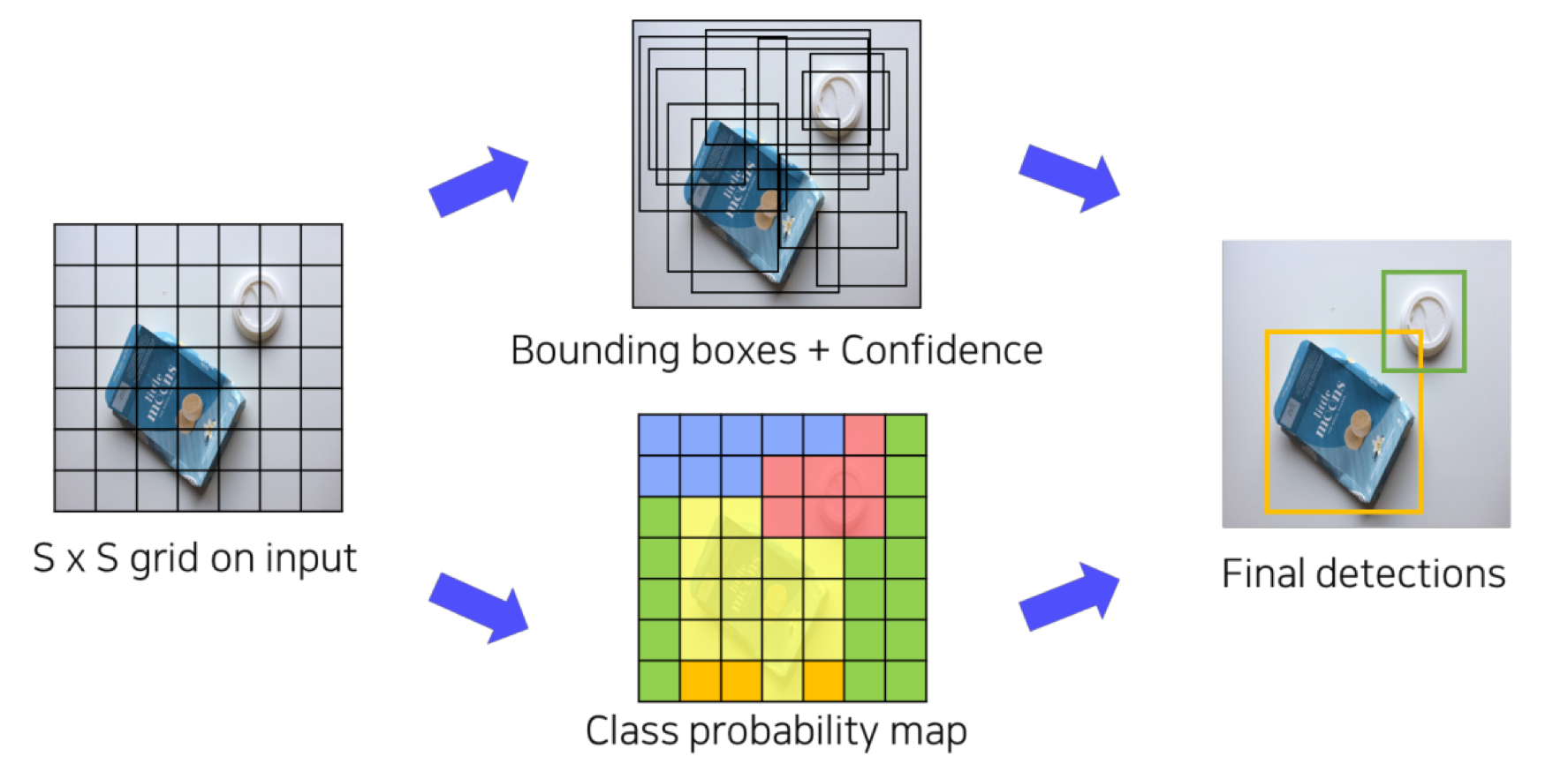 - ์ ์ฒด ์ด๋ฏธ์ง์์ bbox ์์ธก๊ณผ ํด๋์ค๋ฅผ ์์ธกํ๋ ์ผ์ ๋์์ ์งํ