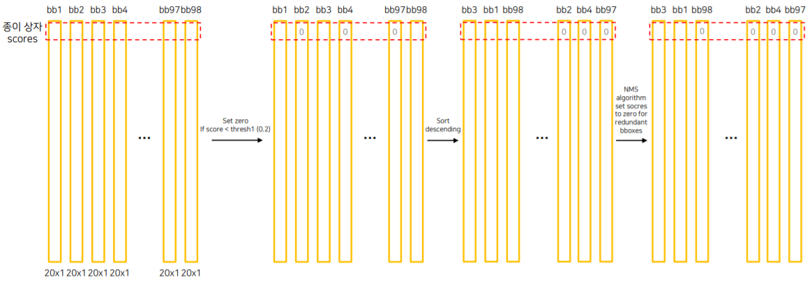 => ์ด 7*7*2 = 98 ๊ฐ์ ์์ธก cell์ด ๋ง๋ค์ด ์ง๋ค. ์ด 98๊ฐ์ cell์ threshold๊ฐ์ผ๋ก ํํฐ๋ง ํ descendingํ๊ณ , NMS ์ฐ์ฐ์ ์ํํ๋ค.