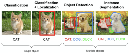 ํ ๋ฌผ์ฒด (single object)๊ฐ ์๋ ์ฌ๋ฌ ๋ฌผ์ฒด์ ๋ํด ์ด๋ค ๋ฌผ์ฒด์ธ์ง ํด๋ ์ค๋ฅผ ๋ถ๋ฅํ๋ classification ๋ฌธ์ ์ ๊ทธ ๋ฌผ์ฒด๊ฐ ์ด๋์ ์๋์ง๋ฅผ Bounding box๋ฅผ ํตํด ์์น ์ ๋ณด๋ฅผ ๋ํ๋ด๋ Localization ๋ฌธ์ ๋ฅผ ๋ชจ๋ ํฌํจํ๋ค.