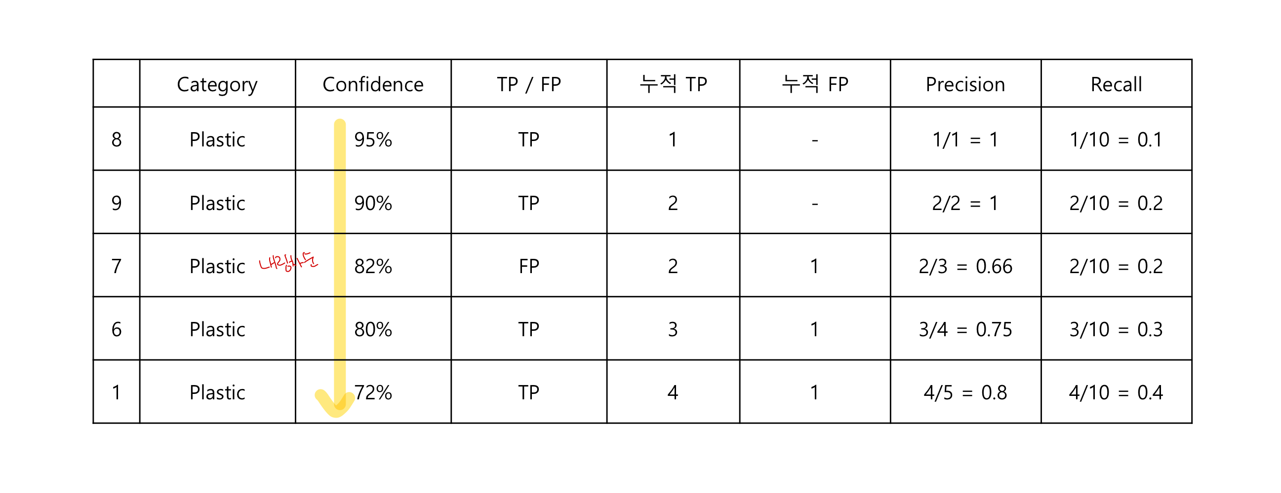 - ์ ์ฒด ํด๋์ค ๊ฐ์์ AP ๊ณ์ฐ ํ ํ๊ท ๋ธ ๊ฐ์ด mAP
