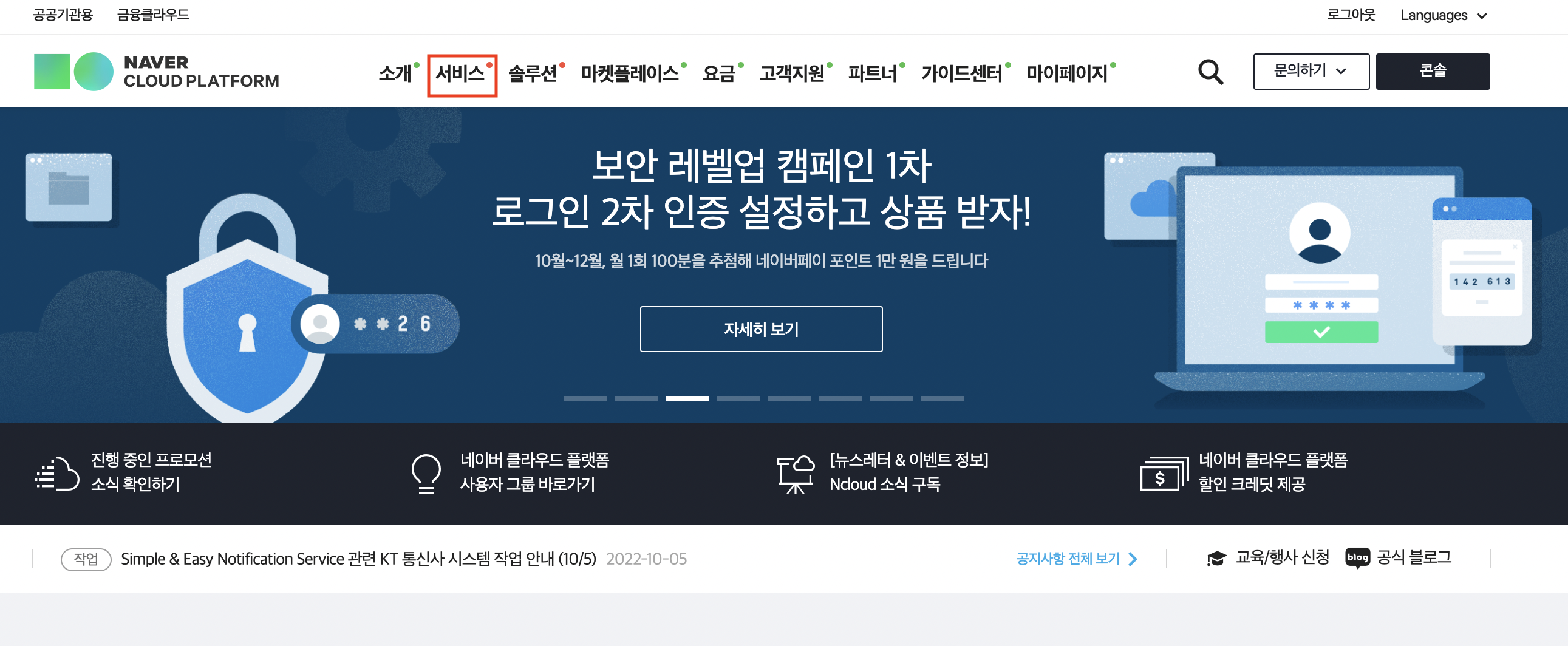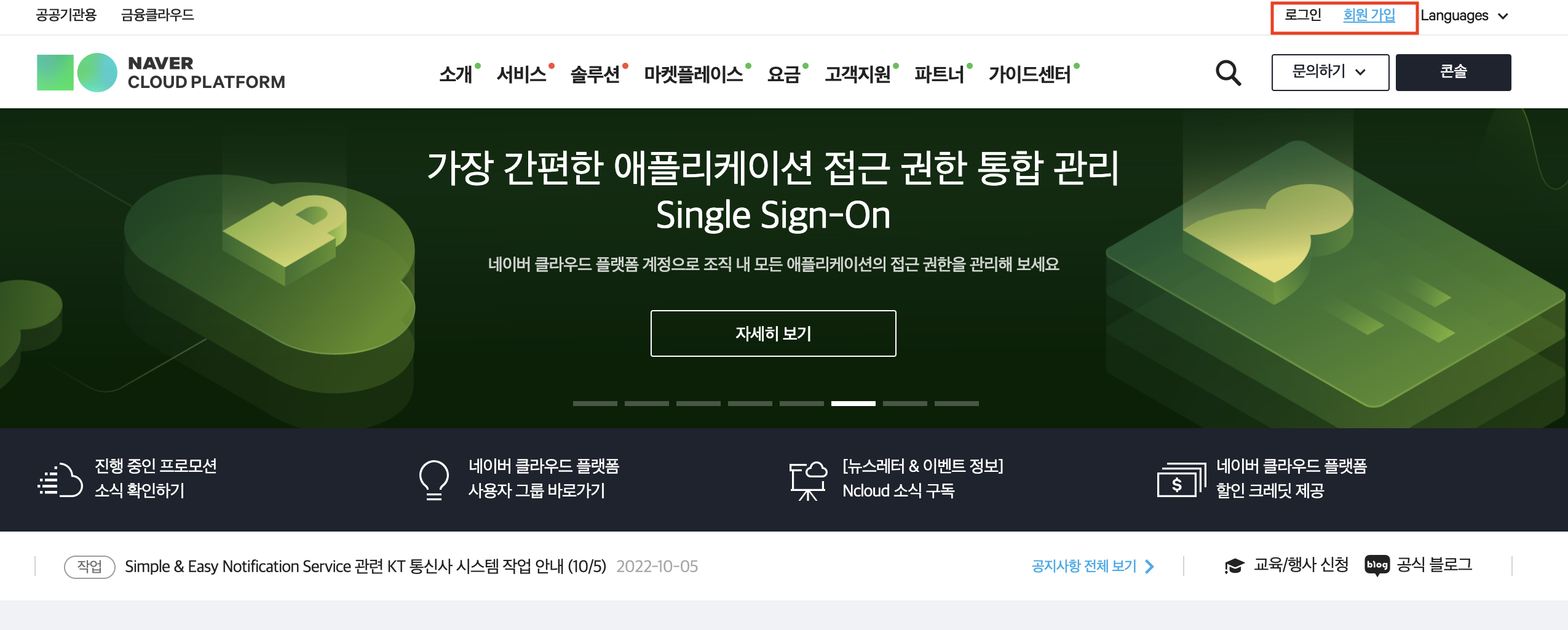 Naver Cloud Platform ๊ณ์ ์ด ์๋ค๋ฉด ํ์๊ฐ์ ํ ๋ก๊ทธ์ธํ๋ค.