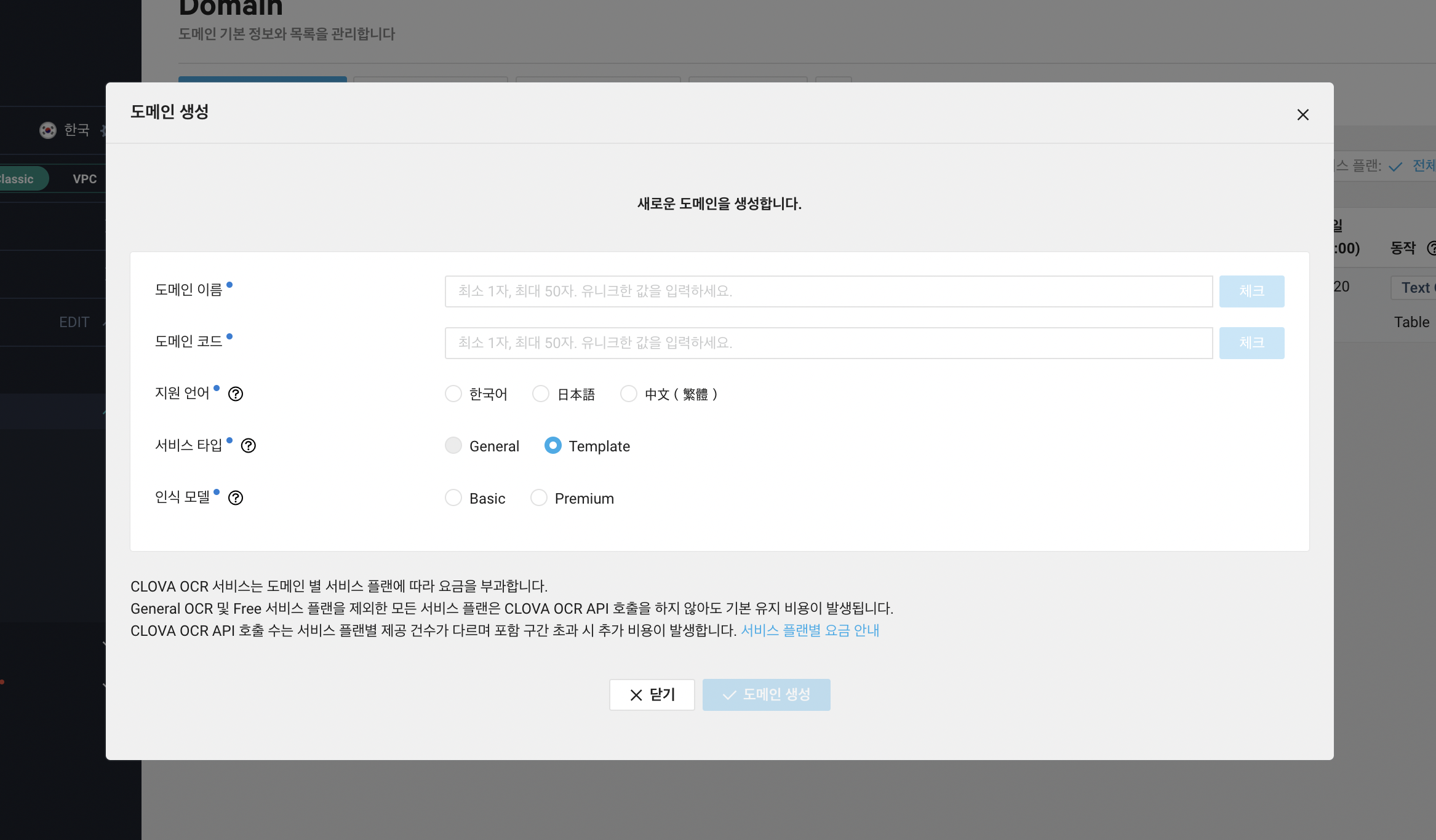 Naver Cloud Platform ์ ์ ์ํ์ฌ CLOVA OCR -> Domain -> ๋๋ฉ์ธ ์์ฑ ํด๋ฆญ