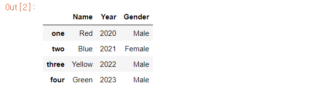 data = {'Name' : ['Red','Blue','Yellow','Green'],