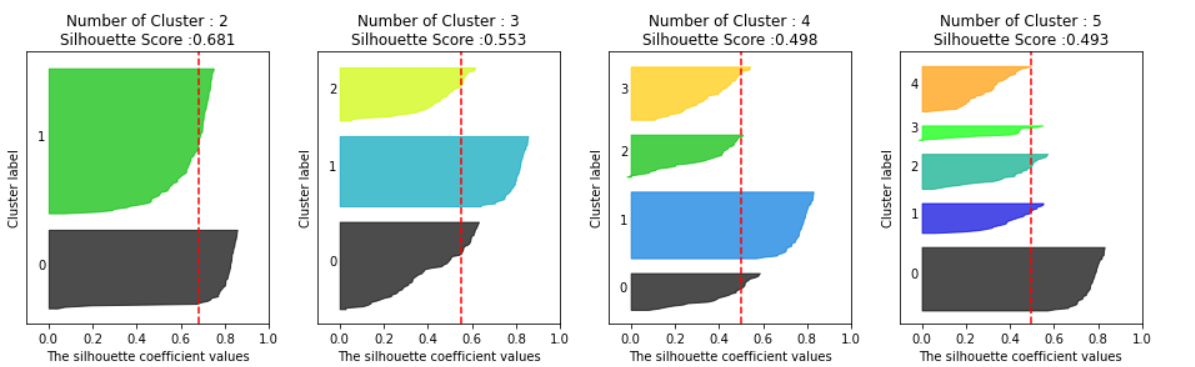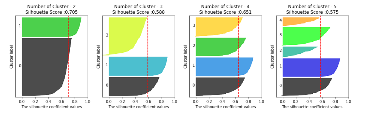 visualize_silhouette([ 2, 3, 4, 5], X)